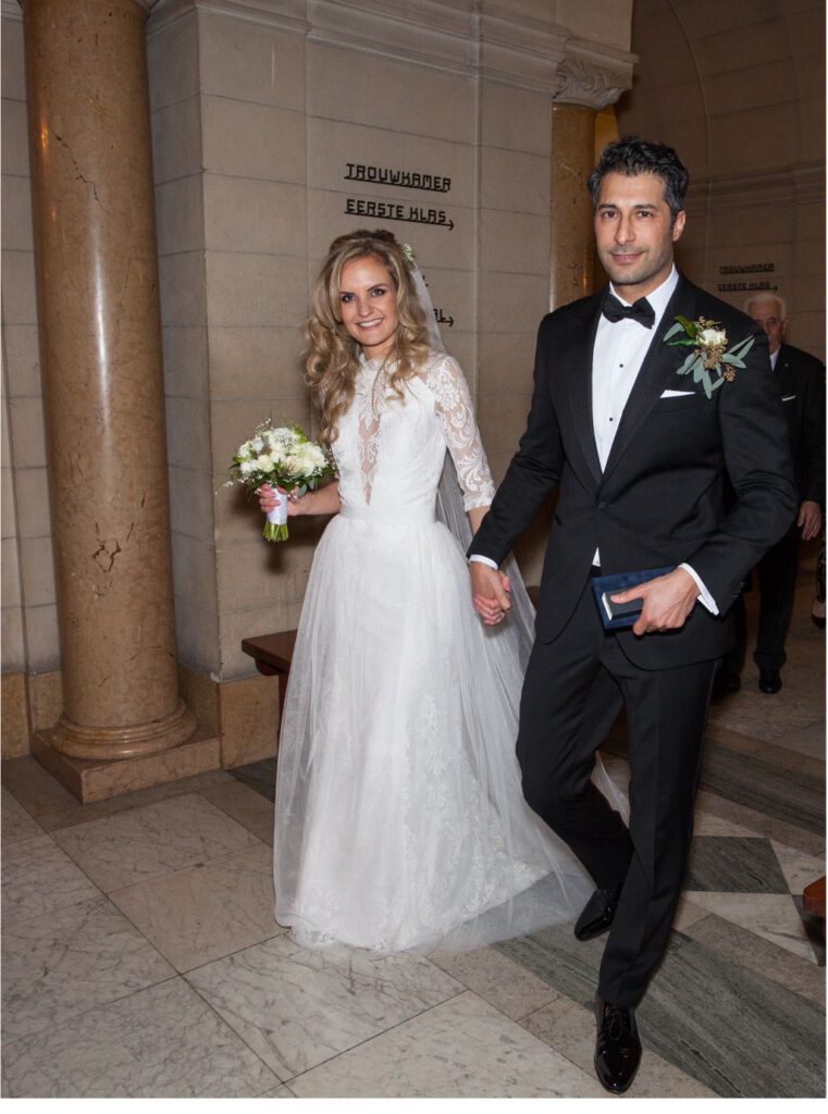 Aan de achterkant heeft de jurk een open rug waar het kant tot aan hals overheen valt. In het mudden zit een blinde rits waar het patroon van het kant op patroon doorloopt. De sleep komt uit één punt zodat het slanke silhouet aan de voorkant behouden wordt. Voor de avond is de sleep op te knopen met een knoopje zodat niet iedereen op de sleep gaat staan. Het was een Turkse bruiloft waar veel gedanst werd en de jurk heeft de bruiloft glansrijk doorstaan.