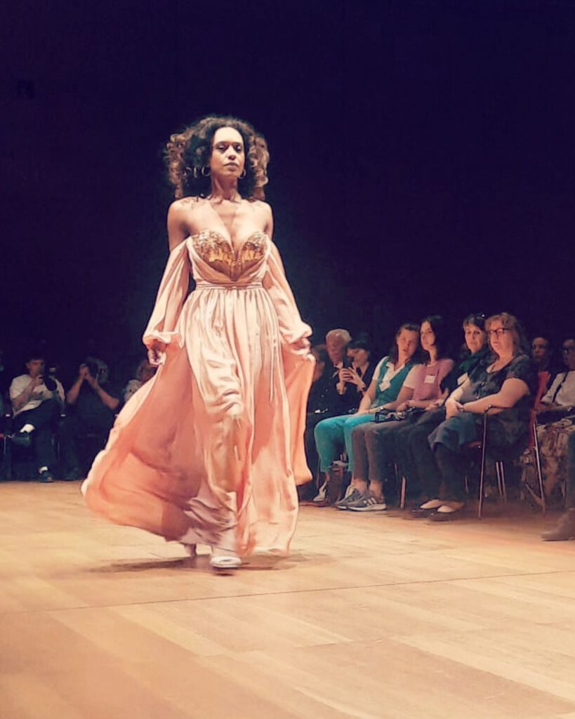 Nadat de jurk geshowd is hebben Marjolein en Bas moeten concluderen dat het borduurwerk wat zo dicht op elkaar zit, op afstand overgaat in één geheel. Volgende keer meer openheid aanbrengen in het werk als het voor de catwalk is en minder op het detail gaan zitten.