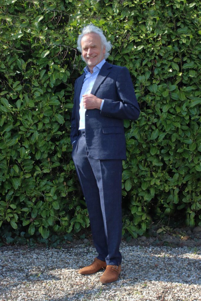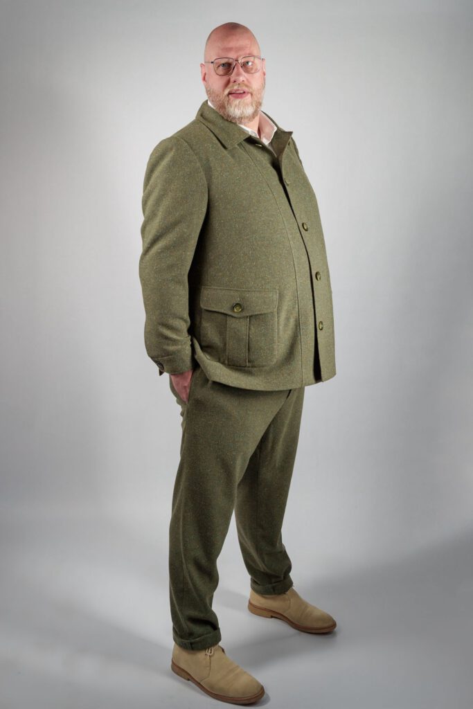 Om de vak-erkenning heren te behalen heb ik in 2025, naast het blauwe pak, dit jagergroene sportieve pak gemaakt. De stof is een geruwde wollen stof met een spikkeltje. De klant heeft een grote maat, confectie 64 dus het was een uitdaging om voor deze grote maat een pak te bedenken. De drager is iemand die geen pakken draagt maar voor sportief gaat.