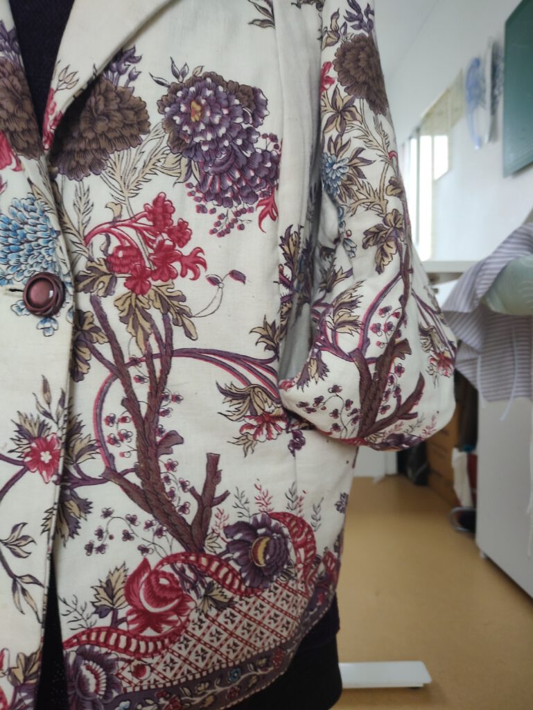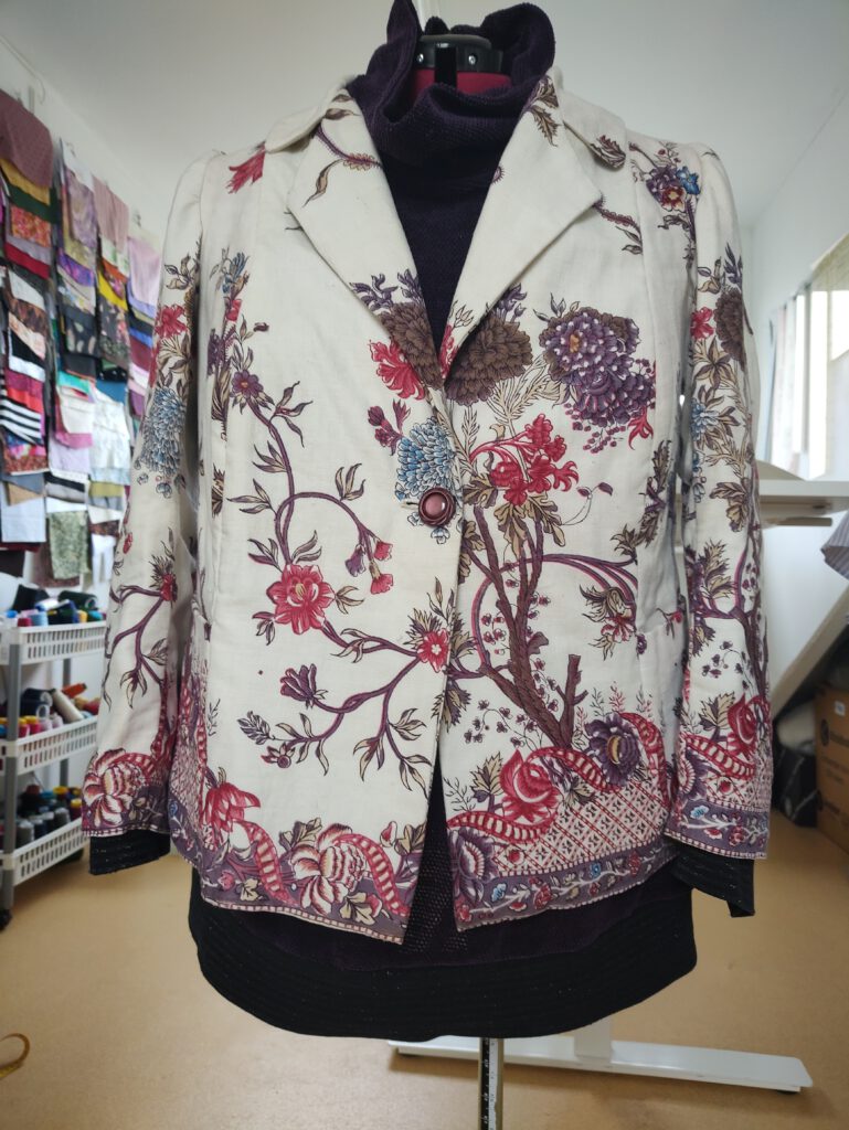 Ik wist eerst niet wat een goede bestemming was voor de stof, zelf draag ik nooit rokken. In mijn eigen ogen word ik daar vierkant van.  Toen iemand opperde om er een jasje van te maken sprak me dat aan.